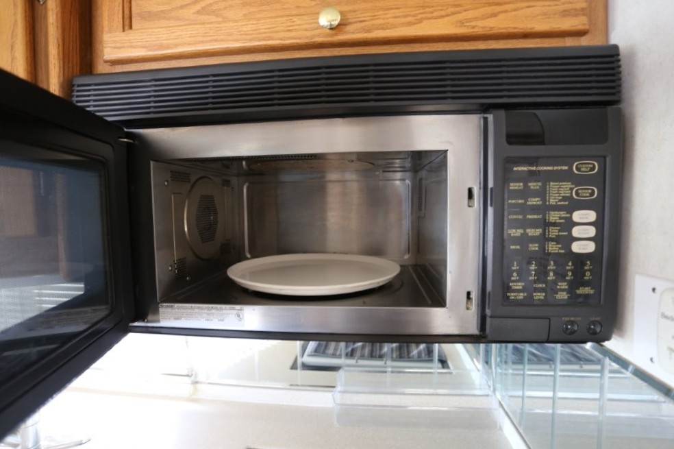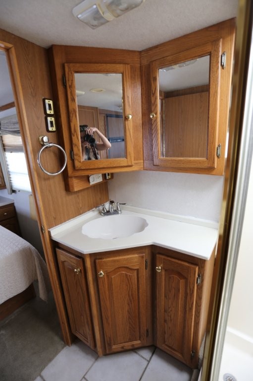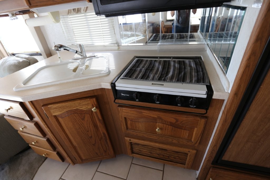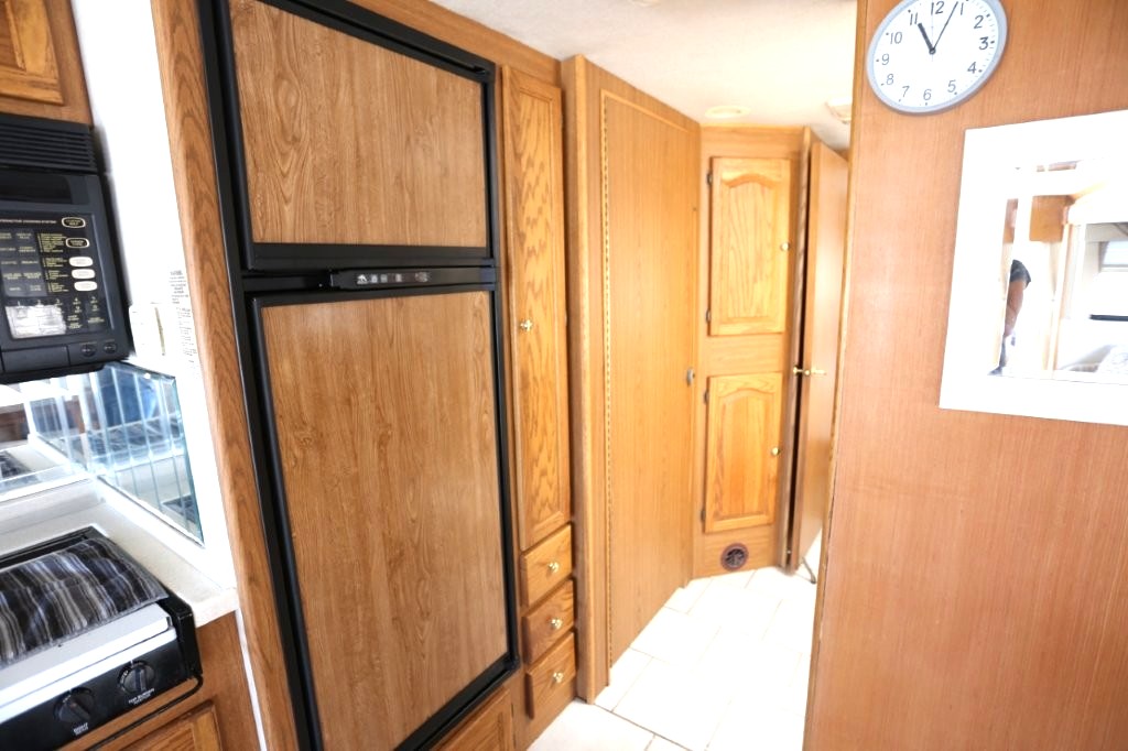 The kitchen offers an angled solid-surface countertop for maximum usable counterspace and a beveled mirror backsplash. Storage is abundant with multiple drawers and cabinets, plus a pantry cabinet with two slide-out storage bins. Appliances include a double-basin sink with cutting board covers, single-lever faucet with separate purified water tap, Sharp convection microwave, Magic Chef three-burner cooktop with folding cover, and a Norcold double-door refrigerator with wood-grain door panel inserts.