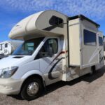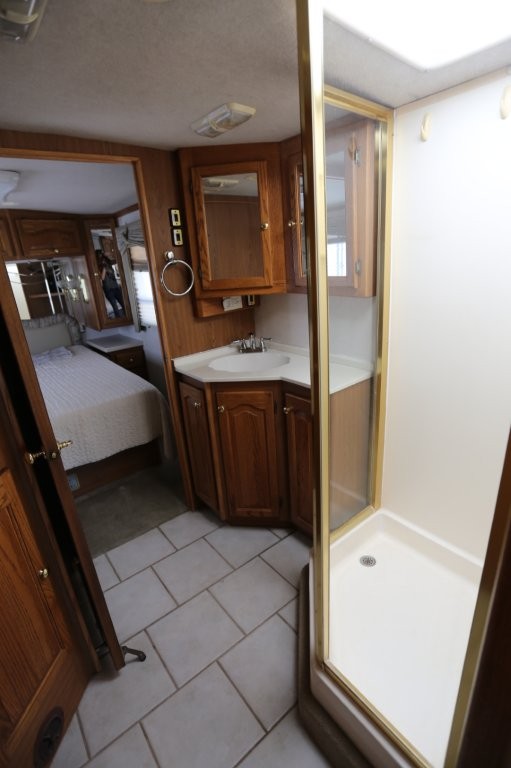 In the cab, this coach is equipped with Flexsteel Ultraleather seating with fabric inserts, 6-way power captain’s chairs, a passenger footrest, automotive-style dash with burlwood print instrument panel, rear-view monitor, and Sirius-ready AM/FM/CD player with Bluetooth, USB, and auxiliary inputs. The over-cab entertainment center includes a hanging flat-screen TV, electronics cabinets, and side storage cabinets.