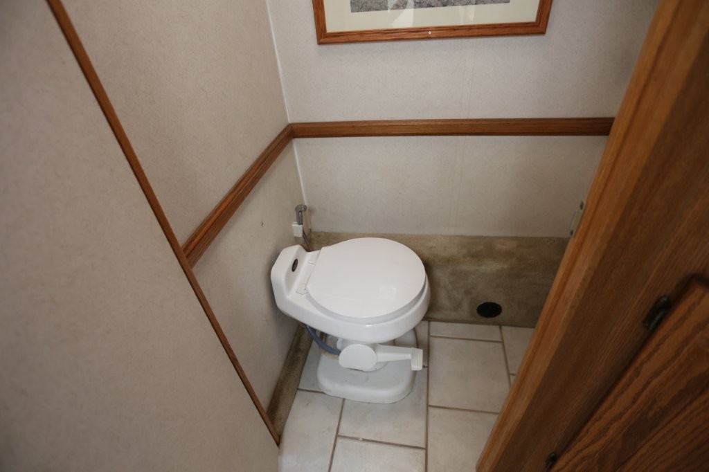 The mid-coach pass-through split bathroom includes a vanity with large storage compartment, solid-surface countertop with integrated sink, mirrored medicine cabinet with overhead lighting, hanging hair dryer, corner glass-enclosed shower with skylight, linen/storage cabinets, and a floor-to-ceiling door-mounted beveled mirror. The enclosed private toilet room features a foot-flush porcelain toilet, overhead mirrored storage cabinets, and a decorative framed picture.