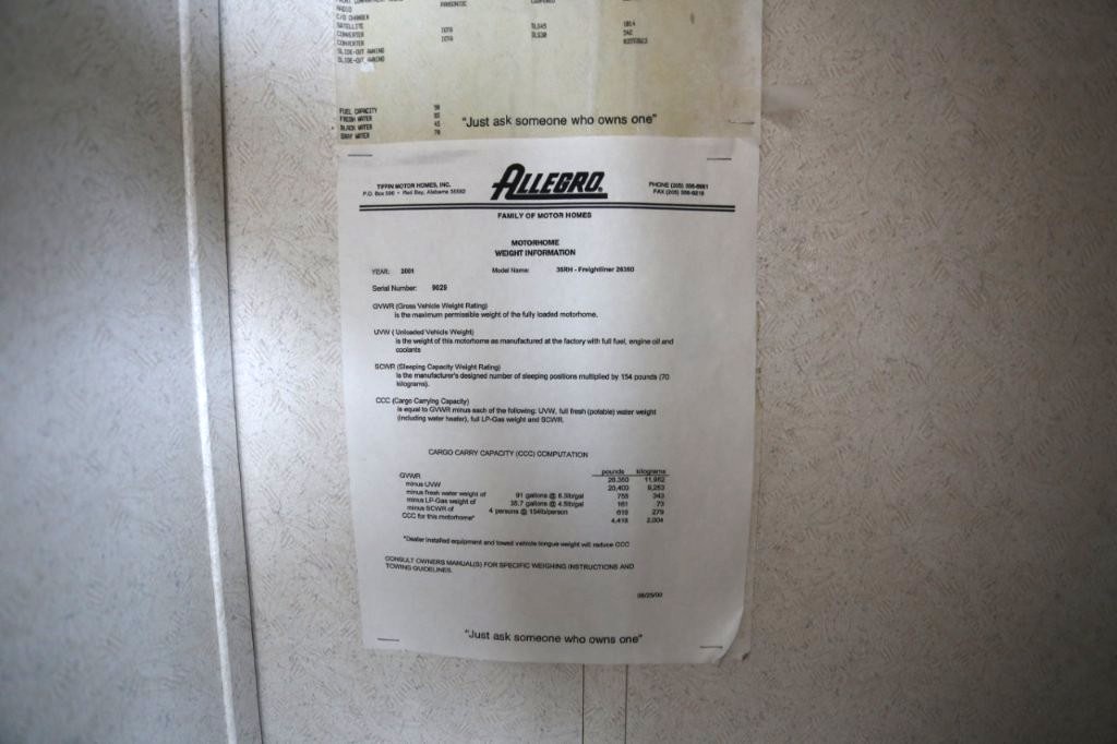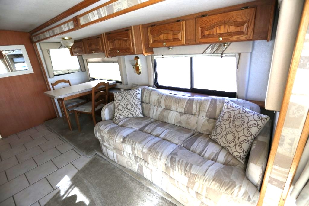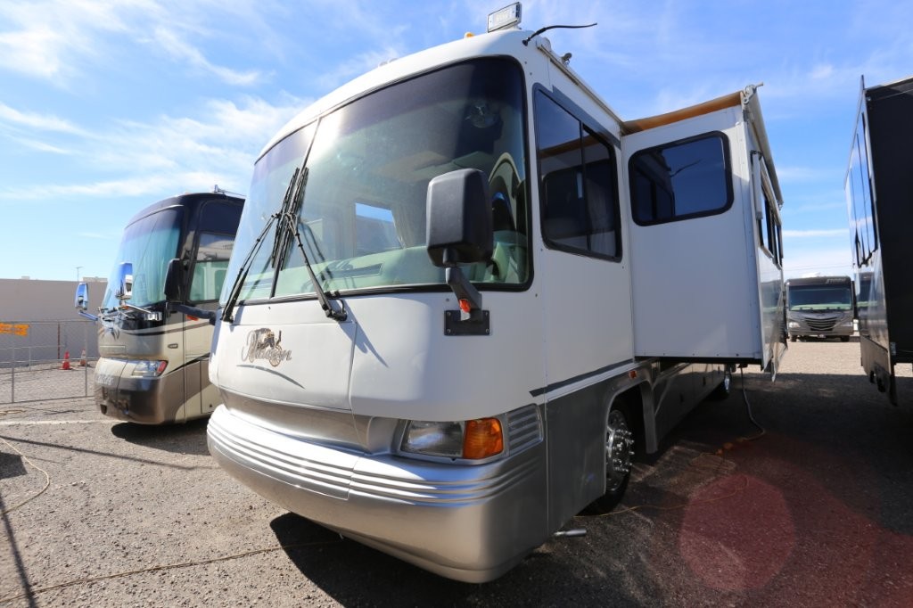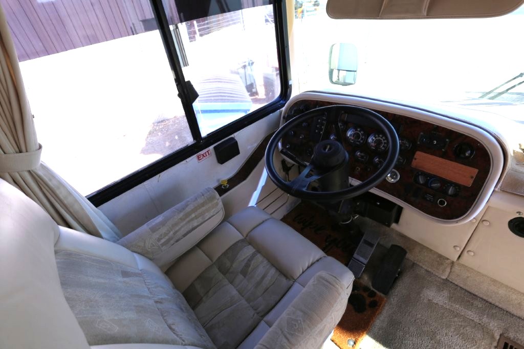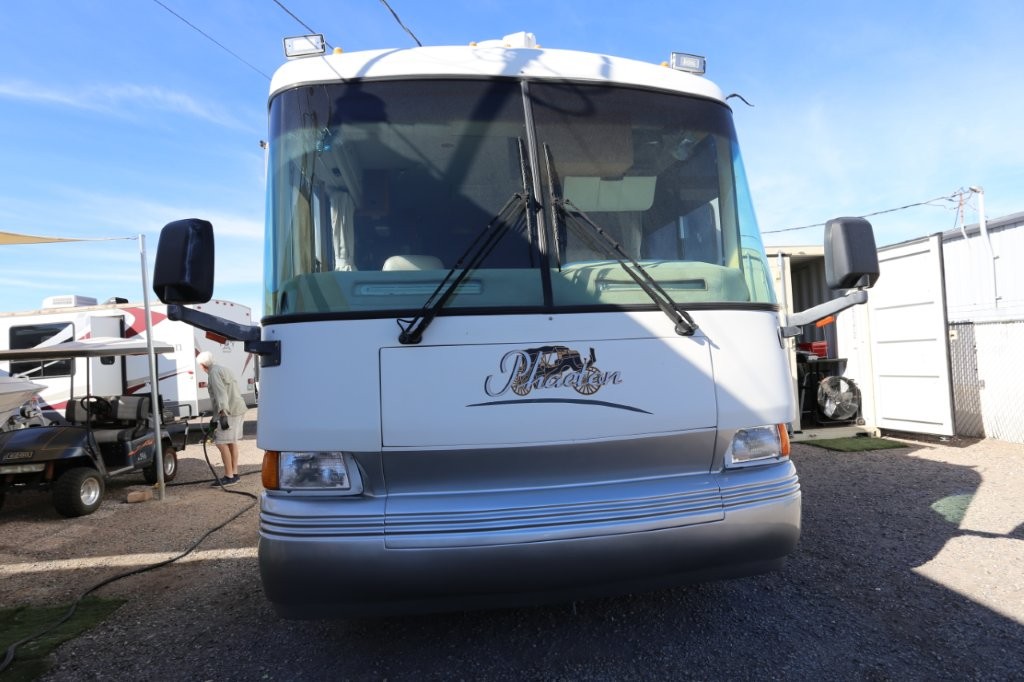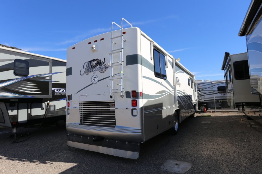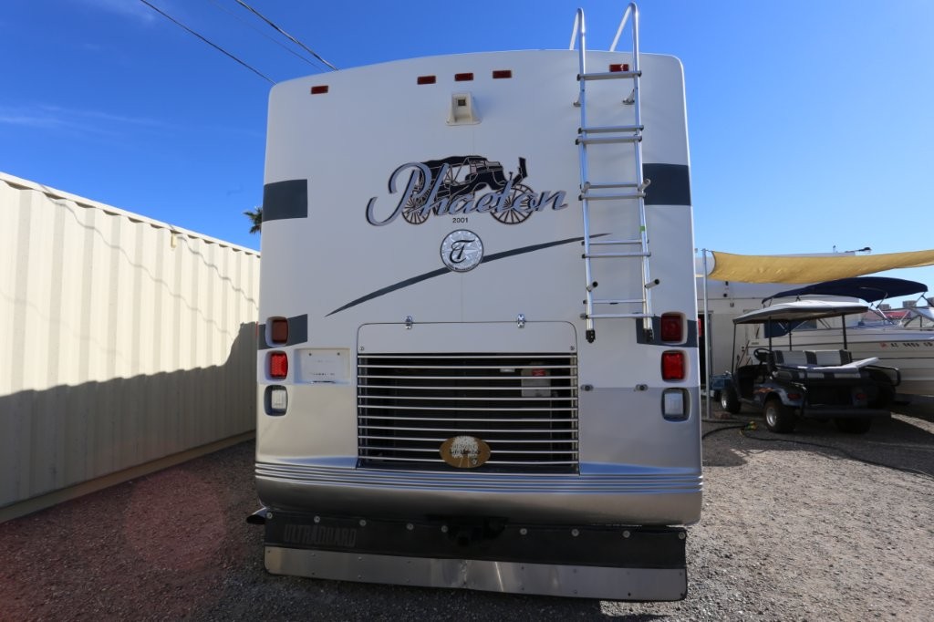 2001 Tiffin Motorhomes Phaeton 35RH, Class A Diesel Pusher motorhome with one slide and 106,227 miles. This is a luxurious, quality unit with high-class amenities. It is furnished with Flexsteel furniture, hardwood raised panel cabinet doors, solid surface countertops, ceramic tile flooring, Scotchgard-treated carpeting, and day/night pleated shades.
